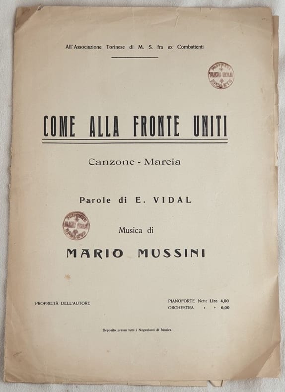 Spartito per pianoforte "Come alla fronte uniti" senza data ma degli anni '30 del compositore Mario Mussini. Dedicato all'Associazione torinese di M. S. fra ex combattenti. Parole di E. Vidal. Buone condizioni, qualche fioritura e piccolo strappo. In folio. cm 35,5x25,5. pp. 3. Musical score for piano "Come alla fronte uniti" of 1930's by the composer Mario Mussini. Dedicated to Associazione torinese di M. S. fra ex combattenti. Words by E. Vidal. Good conditions, some foxings and little tear. In folio. cm 35,5x25,5. pp. 3.