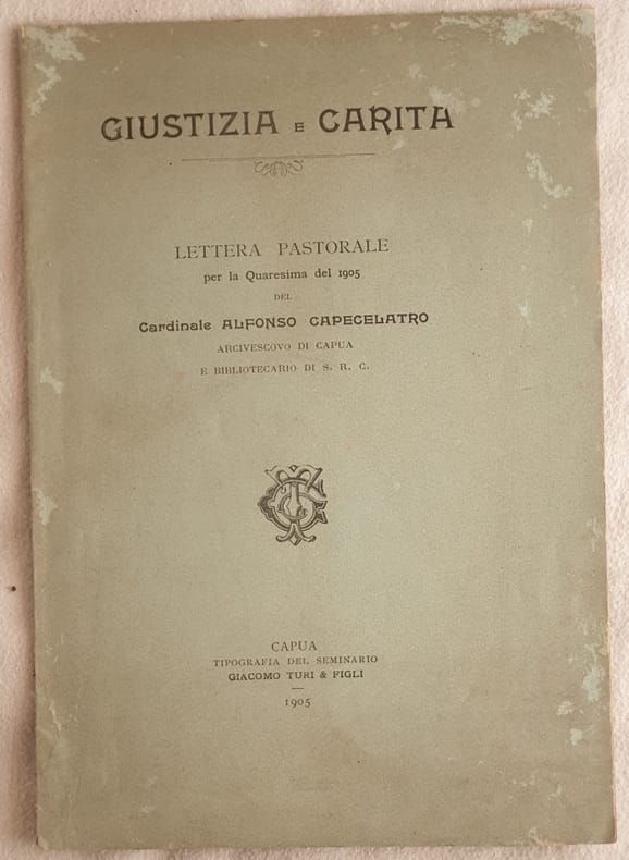 Edizione del 1905 di questa lettera pastorale per la Quaresima del 1905 del Cardinale italiano Alfonso Capecelatro (1824-1880) La lettera è sulla giustizia e carità. In buone condizioni. Copertina editoriale in buone condizioni generali con usure ai margini e dorso. Macchie. Legatura in buone condizioni. All'interno le pagine si presentano in buone condizioni con rare fioriture. In 8. Dim. 23x16 cm. Pp. 24. Edition of 1905 of this pastoral letter of 1905 for Eastern period byt he italian CArdinal Alfonso Capecelatro (1824-1880). The letter is about justice and charity. In good conditions. Editorial cover in good general conditions with wearings in the edges and spine. Stains. Binding in good conditions. Inside pages are in good conditions with occasional foxings. In 8. Dim. 23x16 cm. Pp. 24.