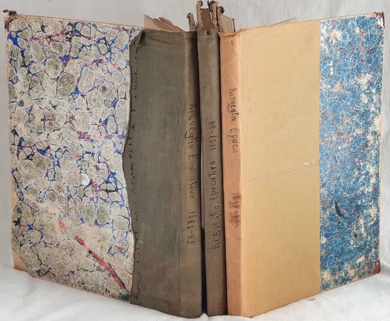 Rarissima raccolta di cinque annate della rivista settimanale per la scuola elementare "Il risveglio educativo" fondato da Guido Antonio Marcati (1855-1922) alla quale collaborarono pedagogisti ed educatori di prestigio. Marcati condusse una lunga battaglia per il rinnovamento della scuola elementare in Italia. La raccolta è cosi composta: dal 15 settembre 1885 al 21 settembre 1884, dal 9 ottobre 1887 al 30 settembre 1888, dal 7 ottobre 1888 al 30 settembre 1889. All'interno: Premi e castighi, La collera e l'educazione del popolo, Le conferenze pedagogiche dei maestri della Germania, La paura del castigo nei fanciulli, Esposizione nazionale a Torino, Rousseau Pestalozzi e Frobel nell'evoluzione pedagogica moderna, La ginnastica e gli esercizi militari nelle scuole, Contro la grammatica, Il lavoro manuale nelle scuole primarie, la scuola popolare, Istruzione pubblica primaria e secondaria a Ginevra, Il progetto di legge per i maestri elementari in senato, Darwin e la scienza educativa, Giusti e l'educazione, Necessita di energia nella maestra, i musei pedagogici, il suicidio e le donne, Il trasloco del R. provveditore agli studi di Treviso, Intorni alla psicologia e pedagogia nell'infanzia, Il corso di pedagogia nella universita di Bologna, Le vignette degli scatolini da cerini, la militarizzazione nei convitti nazionali, Le conferenze in Assisi, Provvedimenti per gli asili infantili, Asili vittoriani, Innocenzo Golfarelli, Per Assisi, scuola rurale, Perche a Pistoia e non a Roma, Ministro Boselli, Il collegio d'Assisi, Il VI congresso nazionale degli insegnanti primari, Il Ministro Boselli a Torino, Pietro Giordani, La mostra didattica abruzzese, Museo pedagogico in Genova, la ginnastica nelle scuole elementari, Il Ministro Boselli a Voghera, Una gita a Canneto sull'Oglio, Psicologia empirica, istruzione e delinquenza, intorno a una istruzione di sordomuti, Il Prof. Andrea Bertoli ecc... Il numero del 24 giugno 1888 pro siciliani. In discrete condizioni. Copertina in mezza tela con titolo manoscritto al dorso in mediocri condizioni generali con usure ai margini e dorso. Parte mancante al piatto anteriore dell'annata 1884. Legatura in mediocri condizioni ma con rotture e corpo del libro in parte staccato. All'interno le pagine si presentano in buone condizioni con rare fioriture. Numerose usure alle prime 54 pagine e 379 dell'annata 1884/85. Pagina 9 mancanti. In folio. Dim. 32,5x24 cm. Pp. XIV+731, 392, 356. Peso Kg. 2,900.Very scarce collection of five year collection for the primary school "Il risveglio educativo" established Guido Antonio Marcati (1855-1922) to which pedagogists and famous educators. Marcati lead a long battle for the renewal of primary school in Italy. The collection is made up of the following numbers: from 15th september 1885 to 21st of september 1884, from the 9th of october 1887 to 30th of september 1888, from the 7th of october 1888 to the 30th of september 1889. Inside: Premi e castighi, cholera and education of people, pedagogical conferences of teachers of Germany, National exposition in Turin, Rousseau Pestalozzi and Frobel in modern pedagogical evolution, The gymnastics and military exercises in schools, Against grammar, manual work in primary schools, popular school, Darwin and educative science, Giusti, pedagocical museums, suicide and women, R. provveditore agli studi di Treviso, psicology and pedagogy in children, Conferences in Assisi, Innocenzo Golfarelli, For Assisi, rural school, Why Pistoia and not in Rome, Ministro Boselli, Il collegio d'Assisi, The VI national congress of teachers of primary school, Ministro Boselli a Torino, Pietro Giordani, Prof. Andrea Bertoli ecc... The number of 24th june 1888 pro siciliani. In fair conditions. Half cloth cover with handwritten title in the spine in poor general conditions with wearings and missing parts in the edges and spine. missing part in the fron plate of year 1884. Binding in poor conditions but with cracks and the body of the book partially detached. Pages in good conditions with occasional foxings. Different wearings in the first 54 pages and 379 of the year 1884/85. Page 9 is missing. In folio. Dim. 32,5x24 cm. Pp. XIV+731, 392, 356. Weight Kg. 2,900.