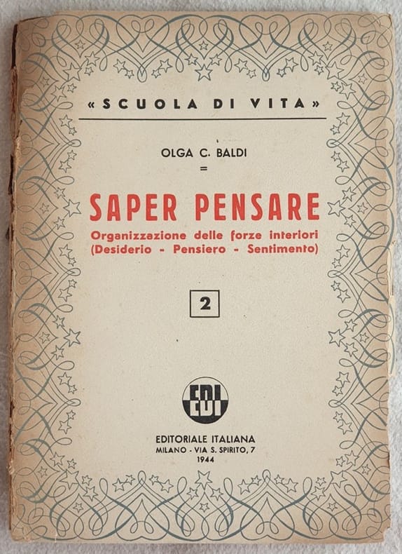 Edizione del 1944 di questo volume sul pensiero scritto da Olga Baldi della collana "Scuola di vita" n. 2. All'interno: potenza dell'amore, comprensione, ideale, la seconda esperienza del pensiero positivo, dualismo, dell'educazione: la bugia, il problema individuale ecc... In buone condizioni. Copertina editoriale in discrete condizioni generali con lievi usure ai margini e dorso. Piatto anteriore staccato. Legatura in buone condizioni. All'interno le pagine si presentano in buone condizioni con fioriture. In 16. Dim. 17,5x12,5 cm. Pp. 90+(6).Edition of 1944 of this volume abotu thought written by Olga Baldi of the series "Scuola di vita" n. 2. In good conditions Editorial cover in fair general conditions slightly worn in the edges and spine. Front plate detached. Binding in good conditions. Inside pages are in good conditions with foxings. In 16. Dim. 17,5x12,5 cm. Pp. 90+(6).
