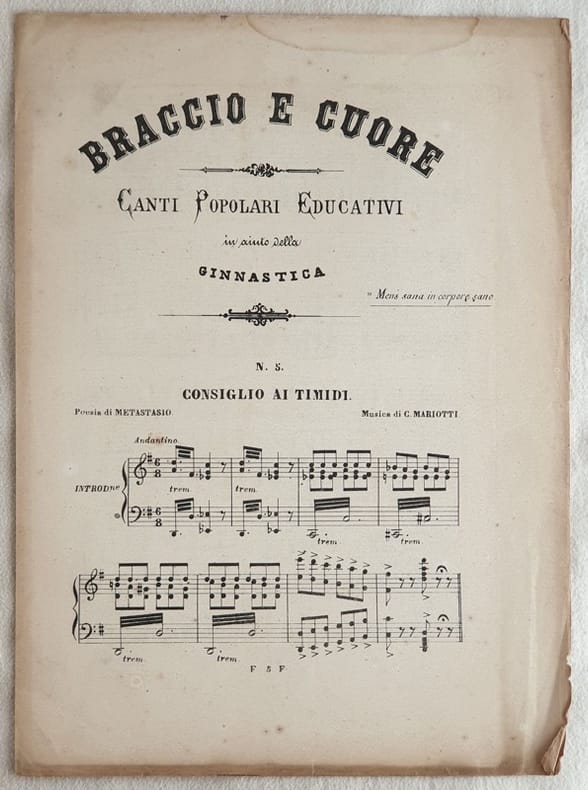 Spartito per pianoforte del 1871 della pubblicazione "Braccio e cuore" canti popolari educativi in aiuto della ginnastica composti da Corinno Mariotti (1827-1876) nato a Parma. Siamo in possesso del solo pezzo n. 5 "Consiglio ai timidi". Parole di Metastasio. In 8. cm 28x20. pp. (4). Discrete condizioni. Alcuni strappi marginali e gore. Musical score of 1871 of the pamphlet "Braccio e cuore" educational popular chants in help of gymnastics composed by Corinno Mariotti (1827-1876) born in Parma. Unfortunately we only have the piece n. 5 "Consiglio ai timidi". Words by Metastasio. In 8. cm 28x20. pp. (4). Fair conditions. Some tears in the edges and water stains.
