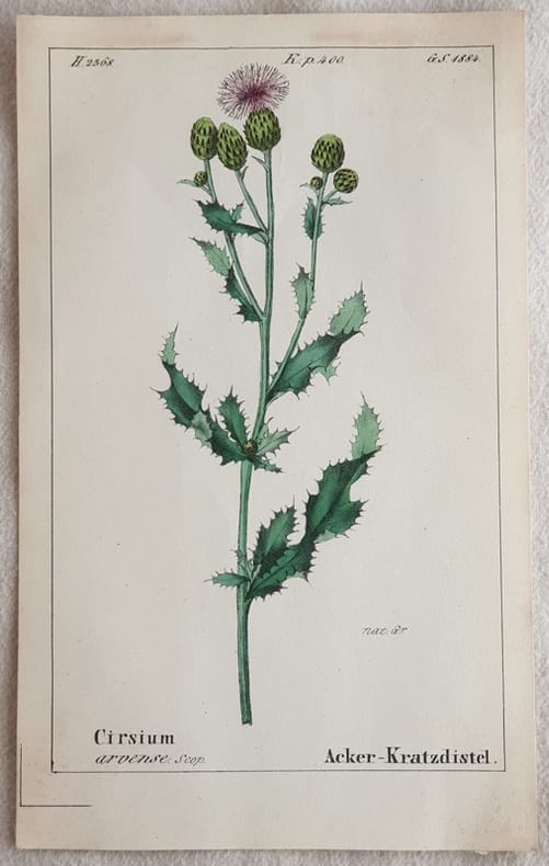 Bella cromolitografia del 1843 tratta dalla celebre opera di botanica "Flora der Schweiz" di Heinrich Romer sulla flora della Svizzera che rappresenta la vicia tetrasperma.<BR>In buone condizioni, qualche fioritura. Segni di colla al verso. Cirsium arvense TECNICA: Cromolitografia DIMENSIONI FOGLIO: cm 17,5x11 DIMENSIONI INCISIONE: cm 15,5x9,5 EPOCA: 1843 CONDIZIONI: Buone condizioni, qualche fioritura. Resto di colla al verso.Beautiful chromolythography of 1843 taken form the famous work of botany "Flora der Schweiz" by Heinrich Romer about flowers of Switzerland representing the lentil vetch. In good conditions, some foxings. Glue signs in the verso of page. TECHNIQUE: Lytography PAGE SIZE: cm 17,5x11 PRINT'S SIZE: cm 15,5x9,5 PERIOD: 1843 CONDITION: good conditions with some foxings. Little tears in the lower edge. Glue signs in the verso of page.