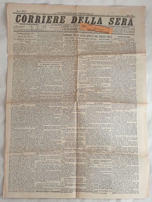 Numero del 27 28 febbraio 1897 di questo storico quotidiano italiano fondato a Milano nel 1876. Tra gli articoli presenti: Le statistiche dell'imperatore, La situazione diplomatica, cannonate fra un avviso greco e una fregata turca, Messidoro, Don Giuseppe Miorelli, il comizio di ieri ad Arona, La terza conferenza di Guglielmo Ferrero ecc.. Belle pubblicità. Etichette. In buone condizioni.Raro. Brossura editoriale in buone condizioni generali con lievi usure ai margini e dorso. Piegature. All'interno le pagine si presentano in buone condizioni con rare fioriture. Piegature ed usure marginali. In folio. Dim. 59,5x44 cm. Pp. 4.Number of the 27th 28th of february 1897 of this historical daily magazine established in Milan in 1876. Between the issues treated: Statistics of emperor, Diplomatic situation, Greece against Turkey, Messidoro, Don Giuseppe Miorelli, Arona, The third conference of Guglielmo Ferrero etc.. In good conditions. Scarce copy. Editorial cover in good general conditions slightly worn in the edges and spine. Foldings and wearings. Inside pages are in good conditions with foxings. Foldings. In folio. Dim. 59,5x44 cm. Pp. 4.