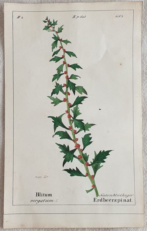 Bella cromolitografia del 1843 tratta dalla celebre opera di botanica "Flora der Schweiz" di Heinrich Romer sulla flora della Svizzera che rappresenta il farinello foglioso. In buone condizioni, qualche fioritura. Segni di colla al verso. Blitum virgatum TECNICA: Cromolitografia DIMENSIONI FOGLIO: cm 17,5x11 DIMENSIONI INCISIONE: cm 15,5x9,5 EPOCA: 1843 CONDIZIONI: Buone condizioni, qualche fioritura. Resto di colla al verso. Beautiful chromolythography of 1843 taken form the famous work of botany "Flora der Schweiz" by Heinrich Romer about flowers of Switzerland representing the leafy goosefoot.<BR>In good conditions, some foxings. Glue signs in the verso of page. Blitum virgatum TECHNIQUE: Lytography PAGE SIZE: cm 17,5x11 PRINT'S SIZE: cm 15,5x9,5 PERIOD: 1843 CONDITION: good conditions with some foxings. Little tears in the lower edge. Glue signs in the verso of page.