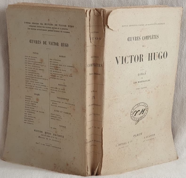 Edizione dei primi del novecento della collana "Oeuvres completes de Victor Hugo". Edizione definitiva sui manoscritti originali. Siamo in possesso solo del romanzo "Les miserables" tomo V Jean Valjean. In discrete condizioni. Copertina editoriale in discrete condizioni generali con usure e strappi ai margini e dorso. Legatura in buone condizioni. All'interno le pagine si presentano in buone condizioni con fioriture. In 8. Dim. 24,5x15,5x2,5 cm. Pp. (6)+517+(5). Edition of early 20th century of the volume "Oeuvres completes de Victor Hugo". Definitive edition on original manuscipts. We only have the volume "Les miserables" tome V Jean Valjean. In fair conditions. Editorial cover in fair general conditions with wearings and tears in the edges and spine. Binding in good conditions. Pages in good conditions with foxings. In 8. Dim. 24,5x15,5x2,5 cm. Pp. (6)+517+(5).