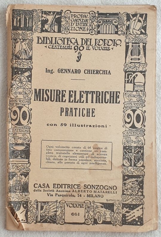 Edizione del 1927 della collana "Biblioteca del popolo" di questo volumetto sulle misure elettriche pratiche scritto da Gennaro Chierchia. All'interno alcune ilustrazioni. In discrete condizioni. Copertina editoriale in discrete condizioni generali con usure e strappi ai margini e dorso. Legatura in buone condizioni. All'interno le pagine si presentano in ottime condizioni con rare fioriture. In 16. Dim. 16,5x11 cm. Pp. 63. Interesting pamphlet of 1927 of the series Biblioteca del popolo of this little volume about electric measures written by Gennaro Chierchia. Some illustrations inside. In fair conditions. Editorial cover in fair general conditions with wearings and tears in the edges and spine. Binding in good conditions. Pages in very good conditions with occasional foxings. In 16. Dim. 16,5x11 cm. Pp. 63.
