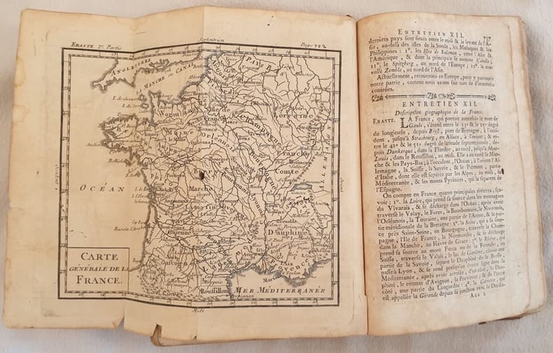 Avignon, Chez les Libraires Assossiés, 1807. 945 g 2 volumes in-8, pleine basane, dos lisses ornés, [2] ff., iv- 523 pp.; [2] ff., 447-[1] pp.. Illustré de 3 cartes dépliantes (Mappe-monde, Europe et France). La mappe-monde et la carte d'Europe sont datées de 1769; la carte de France présente les départements et on y voit notamment ceux du Piémont annexés en 1802 ainsi que plusieurs départements aujourd'hui en Belgique. Quelques usures à la reliure, pli au premiers feuillets, légers défauts. . (Catégories : Enfantina, )