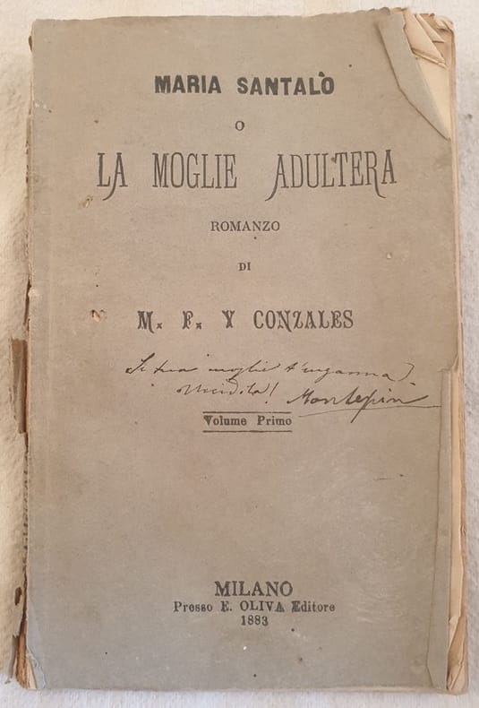 Edizione del 1882 di questo raro romanzo scritto da M. F Y Conzales. Siamo purtroppo in possesso solo del tomo primo. Antiche note manoscritte al piatto anteriore. In discrete condizioni. Copertina editoriale in discrete condizioni generali con usure ai margini e dorso. Legatura in discrete condizioni con qualche rottura. All'interno le pagine si presentano in buone condizioni con rare fioriture. In 16. Dim. 15,5x10 cm. Pp. 127. Edition of 1882 of this scarce novel written by M. F Y Conzales. Unofrtunately we only have the first tome. Ancient handwritten notes in the front plate. In fair conditions. Editorial cover in fair general conditions with wearings in the edges and spine. Binding in fair conditions with some cracks. Pages in good conditions with occasional foxings. In 16. Dim. 15,5x10 cm. Pp. 127.