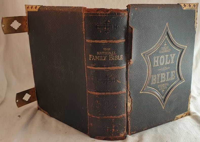 Bella edizione di fine ottocento di questa Bibbia familiare molto in voga in Inghilterra durante l'epoca Vittoriana. <BR><BR>Edizione curata dal Reverendo John Eadie.<BR><BR>Testo inglese con commento di Scott ed Henry contenente numerose note esplicative e critiche selezionate dai grandi autori.<BR><BR>Nella prima parte numerose pagine (mai compilate) con il registro della famiglia, matrimoni, nomi dei figli, morti, galleria dei ritratti di famiglia.<BR><BR>Frontespizio figurato coperto da velina e 25 planches coperte da velina incise da Laplante, Pisan su disegno di Gustave Dore e planches colorate.<BR><BR>Copertina in piena pelle con disegni a rilievo e decorazioni in oro. Borchie di metallo agli angoli e fermagli di chiusura. <BR><BR>In buone condizioni.<BR>Copertina in piena pelle a quattro nervi con titolo in oro al dorso in discrete condizioni generali con lievi usure ai margini e dorso. Piatto anteriore in parte staccato. Velina in parte usurata. Legatura in buone condizioni. All'interno le pagine si presentano in ottime condizioni con rare fioriture. In 8. Dim. 34x28x9 cm. Pp. XV+(8)+1203+59+(1). Peso Kg. 5,830. Beautiful edition of the late 19th century of this family Bible very popular in Egnland during Victorian age. <BR><BR>Edition cared by Reverend John Eadie.<BR><BR>English text with comment byt Scott and Henry containing different explicatory notes and critics selected by big authors.<BR><BR>In the first part different page (never compiled) with reigster of the family, marriages, names of sons, deaths, galleries of portraits of family.<BR><BR>Figurtrated title page covered by tissue paper and 25 planches covered by tissue paper engraved by Laplante, Pisan after Gustave Dore and coloured planches.<BR><BR>Copertina in piena pelle con disegni a rilievo e decorazioni in oro. Borchie di metallo agli angoli e fermagli di chiusura. <BR><BR>In buone condizioni.<BR>Half leather cover with four nerfs and golden title and decorations in the spine in fair general conditions slightly worn in the edges and spine. Front plate partially detached. Binding in good conditions. Inside pages are in very good conditions with occasional foxings. In 8. Dim. 34x28x9 cm. Pp. XV+(8)+1203+59+(1). Weight Kg. 5,830.