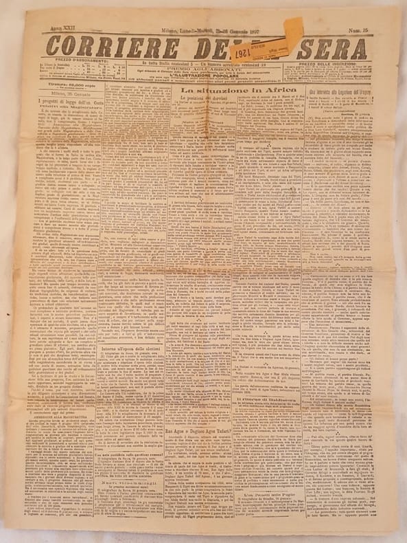 Numero del 25 26 gennaio 1897 di questo storico quotidiano italiano fondato a Milano nel 1876. Tra gli articoli presenti: Il progetti di legge dell'On. Costa, Un intervista alla legazione dell'Uruguay, Il ritorno di Baldissera, Ras Agos o Degiaco Agos Tafari, PEr una zona doganale neutra ed intermedia, L'opinione del colonnelo Stevani, Concerto Badia, Per i danneggiati di Sant'Anna ecc.. Belle pubblicità. Etichette. In buone condizioni.Raro. Brossura editoriale in buone condizioni generali con lievi usure ai margini e dorso. Piegature. All'interno le pagine si presentano in buone condizioni con rare fioriture. Piegature ed usure marginali. In folio. Dim. 59,5x44 cm. Pp. 4. Number of the 25th 26th of january 1897 of this historical daily magazine established in Milan in 1876. Between the issues treated: the projects of law of On. Costa, An itnerview to legation to Uruguay, Baldissera, Ras Agos or Degiaco Agos Tafari, for a neutral custom, Opinion of colonel Stevani, Concert Badia, For ruined people of Sant'Anna etc.. In good conditions. Scarce copy. Editorial cover in good general conditions slightly worn in the edges and spine. Foldings and wearings. Inside pages are in good conditions with foxings. Foldings. In folio. Dim. 59,5x44 cm. Pp. 4.