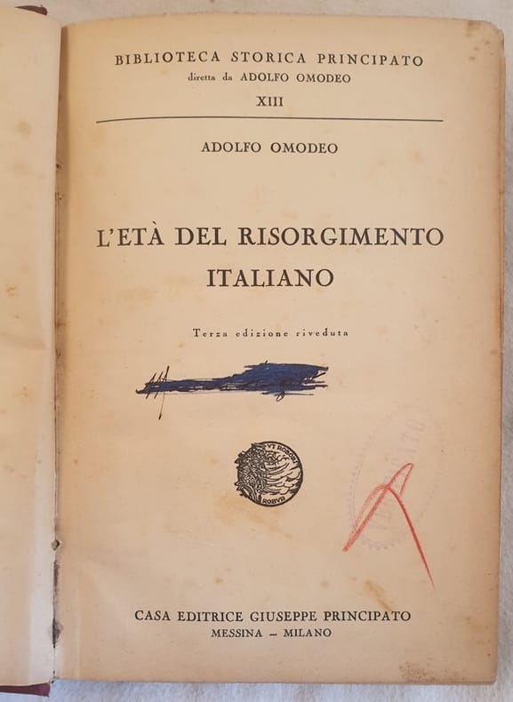 Edizione del 1939 di questo studio sul risorgimento italiano scritto da Adolfo Omodeo. All'interno: equilibrio europeo, antico regime e illuminismo, La politica internazionale dalla guerra dei sette anni alla rivoluzione, l'assemblea costituente, assemblea legislativa, convenzione nazionale, guerre del direttorio, consolato, impero, reataurazione, la rivoluzione di luglio, Giuseppe Mazzini e Vincenzo Gioberti, La rivoluzione europea, il decennio di rpeparazione, il 1859, il 1860, I primi anni del Regno d'Italia Venezia e Roma, La storia europea dal 1870 al 1878, La fine sel sec. XIX e l'inziio del XX, la guerra mondiale ecc... Numerose planches fotografiche all'interno. In buone condizioni. Copertina in tela in discrete condizioni generali con lievi usure ai margini e dorso. Macchie Legatura in buone condizioni. All'interno le pagine si presentano in buone condizioni con fioriture. In 8. Dim. 21x15 cm. Pp. 526+(2). Ediiton of 1939 of this study about iatlian Risorgimento written by Adolfo Omodeo. Different photogrpahic planches inside In good conditions.