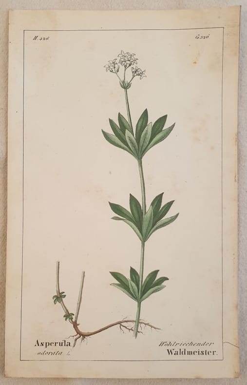Bella cromolitografia del 1843 tratta dalla celebre opera di botanica "Flora der Schweiz" di Heinrich Romer sulla flora della Svizzera che rappresenta l'asperula. In buone condizioni, qualche fioritura. Segni di colla al verso. Asperula odorata TECNICA: Cromolitografia DIMENSIONI FOGLIO: cm 17,5x11 DIMENSIONI INCISIONE: cm 15,5x9,5 EPOCA: 1843 CONDIZIONI: Buone condizioni, qualche fioritura. Resto di colla al verso.Beautiful chromolythography of 1843 taken form the famous work of botany "Flora der chweiz" by Heinrich Romer about flowers of Switzerland representing the sweet scented Bedstraw. In good conditions, some foxings. Glue signs in the verso of page Asperula odorata TECHNIQUE: Lytography PAGE SIZE: cm 17,5x11 PRINT'S SIZE: cm 15,5x9,5 PERIOD: 1843 CONDITION: good conditions with some foxings. Little tears in the lower edge. Glue signs in the verso of page.
