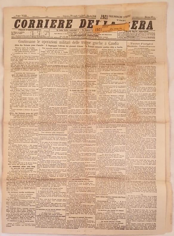 Numero del 18 19 febbraio 1897 di questo storico quotidiano italiano fondato a Milano nel 1876. Tra gli articoli presenti: Continuano le operazioni militari delle truppe greche a Candia, una lettera del generale Albertone, L'unificazione tributaria del comune ecc.. Belle pubblicità. Etichette. In buone condizioni.Raro. Brossura editoriale in buone condizioni generali con lievi usure ai margini e dorso. Piegature. All'interno le pagine si presentano in buone condizioni con rare fioriture. Piegature ed usure marginali. In folio. Dim. 59,5x44 cm. Pp. 4. Number of the 18th 19th of february 1897 of this historical daily magazine established in Milan in 1876. Between the issues treated: military operations of grek troops in Candia, a letter of gneeral Albertone, Tributary unification of Comune etc.. In good conditions. Scarce copy.Editorial cover in good general conditions slightly worn in the edges and spine. Foldings and wearings. Inside pages are in good conditions with foxings. Foldings. In folio. Dim. 59,5x44 cm. Pp. 4.