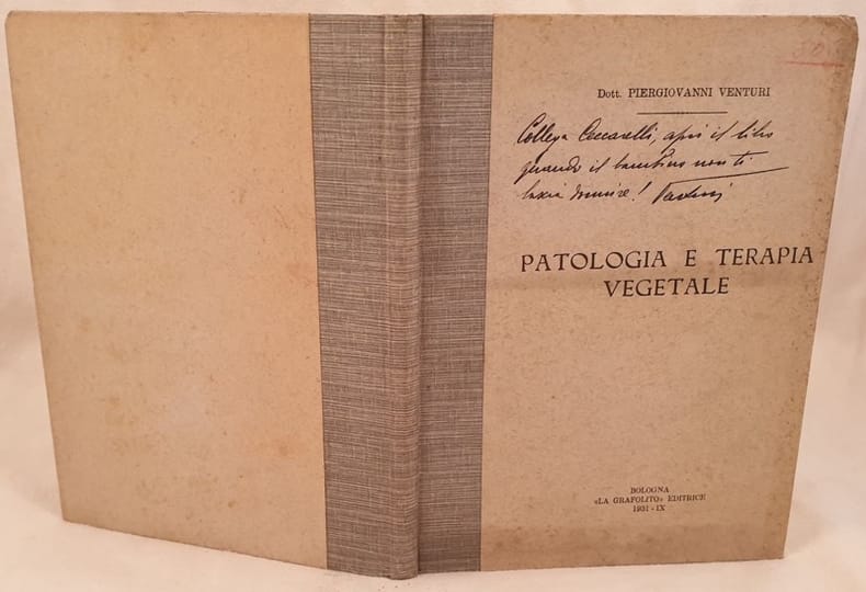 Edizione del 1931 di questa raccolta di appunti di patologia vegetale delle lezioni tenute dal Dott. Piergiovanni Venturi nella Regia Scuola Agraria media Zanelli a Reggio Emilia nell'anno scolastico 1930-31. La raccolta è formata da dispense in copia litografata battuta a macchina. Dedica con firma autografa dell'autore in copertina. In ottime condizioni. Copertina cartonata editoriale in ottime condizioni generali con lievi usure ai margini e dorso. Legatura in buone condizioni. All'interno le pagine si presentano in ottime condizioni con rare fioriture. In 8. Dim. 24x17,5 cm. Pp. 193+(1). Edition of 1931 ofm this collection of notes of vegetal pathology from lessons held by Dott. Piergiovanni Venturi in the Regia Scuola Agraria media Zanelli in Reggio Emilia during the year 1930-31. The collection is made up of instalments in lythographed typewritten copy . Dedication with autographed signature of the author in the cover. In very good conditions. Editorial carton cover in very good conditions slightly worn in the edges and spine. Binding in good conditions. Inside pages are in very good conditions with occasional foxings. In 8. Dim. 24x17,5 cm. Pp. 193+(1).