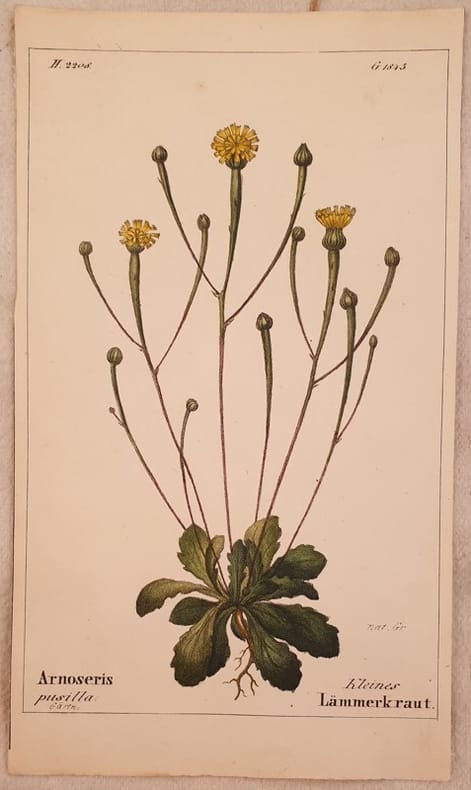 Bella cromolitografia del 1843 tratta dalla celebre opera di botanica "Flora der Schweiz" di Heinrich Romer sulla flora della Svizzera che rappresenta la Arnoseris pusilla. In buone condizioni, qualche fioritura. Segni di colla al verso. Arnoseris pusilla TECNICA: Cromolitografia DIMENSIONI FOGLIO: cm 17,5x11 DIMENSIONI INCISIONE: cm 15,5x9,5 EPOCA: 1843 CONDIZIONI: Buone condizioni, qualche fioritura. Resto di colla al verso. Beautiful chromolythography of 1843 taken form the famous work of botany "Flora der Schweiz" by Heinrich Romer about flowers of Switzerland representing the Arnoseris pusilla. In good conditions, some foxings. Glue signs in the verso of page. Arnoseris pusilla TECHNIQUE: Lytography PAGE SIZE: cm 17,5x11 PRINT'S SIZE: cm 15,5x9,5 PERIOD: 1843 CONDITION: good conditions with some foxings. Little tears in the lower edge. Glue signs in the verso of page.