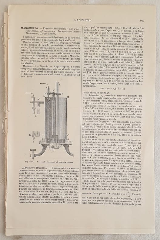 Interessante estratto del 1890 tratto dall'Enciclopedia delle arti e industrie edita da Utet sul manometro scritto da Stefano Pagliani. La parte relativa ai manometri inizia da pag. 775 e consta di 10 pagine. All'interno numerose illustrazioni che mostrano modelli di manometri e meccanismi. In ottime condizioni. Copertina assente. Legatura in buone condizioni. All'interno le pagine si presentano in ottime condizioni con rare fioriture. In 4. Dim. 29x19,5 cm. Pp. da 775 a 784. Interesting extract of 1890 from Enciclopedia delle arti e industrie edited by Utet about pressure gauges by Stefano Pagliani. The part relating pressure gauges begins from pag. 775 and is made up of 10 pages. Inside different illustrations showing different pressure gauges and mechanisms In very good conditions. Cover is missing. Binding is almost missing. Inside pages are in very good conditions with occasional foxings. In 4. Dim. 29x19,5 cm. Pp. da 775 a 784.