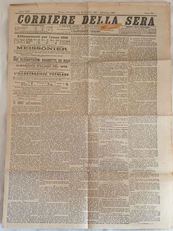 Numero del 31 dicembre 1897 1 gennaio 1898 di questo storico quotidiano italiano fondato a Milano nel 1876. Tra gli articoli presenti: Il 1897 all'estero, I principi di Napoli andranno a Palermo, Nel Sudan Egiziano, La relazione di Giosue Carducci, Al consiglio comunale di Milano, Il generale Morra a Pietroburgo, Matteo Dreyfus ecc.. Belle pubblicità. Etichette. In buone condizioni.Raro. Brossura editoriale in buone condizioni generali con lievi usure ai margini e dorso. Piegature. All'interno le pagine si presentano in buone condizioni con rare fioriture. Piegature ed usure marginali. In folio. Dim. 59,5x44 cm. Pp. 4.Number of the 31st of december 1897 1st of january 1897 of this historical daily magazine established in Milan in 1876. Between the issues treated: 1897 in foreign countries, the Prince of Naples will go in Palermo, In Sudan Egiziano, The relationship of Giosue Carducci, In Comunal Council of Milan, The general Morra in Petersburg, Matteo Dreyfus etc.. In good conditions Scarce copy. Editorial cover in good general conditions slightly worn in the edges and spine. Foldings and wearings. Inside pages are in good conditions with foxings. Foldings. In folio. Dim. 59,5x44 cm. Pp. 4.