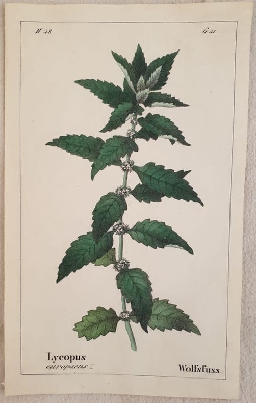 Bella cromolitografia del 1843 tratta dalla celebre opera di botanica "Flora der Schweiz" di Heinrich Romer sulla flora della Svizzera che rappresenta il piede di lupo. In buone condizioni, qualche fioritura. Segni di colla al verso. Lycopus auropaeus TECNICA: Cromolitografia DIMENSIONI FOGLIO: cm 17,5x10,5 DIMENSIONI INCISIONE: cm 15,5x9,5 EPOCA: 1843 CONDIZIONI: Buone condizioni, qualche fioritura. Resto di colla al verso.Beautiful chromolythography of 1843 taken form the famous work of botany "Flora der Schweiz" by Heinrich Romer about flowers of Switzerland representing gypsywort In good conditions, some foxings. Glue signs in the verso of page Lycopus auropaeus TECHNIQUE: Lytography PAGE SIZE: cm 17,5x11 PRINT'S SIZE: cm 16x9,5 PERIOD: 1843 CONDITION: good conditions with some foxings. Little tears in the lower edge. Glue signs in the verso of page.