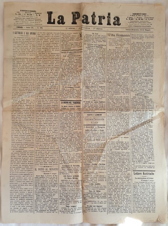 Numero del 12 13 maggio 1900 di questo raro quotidiano politico marchigiano. Tra gli articoli presenti: i cattolici e gli operai, La guerra nel TRansvaal, Il procuratore Cavalli, I disordini in Spagna, La succesione al trono d'Austria, Vita romana, Industria e commercio nel porto di Genova, Dalle Marche (Osimo, Recanati), Ancon Dorica, Rivista navale. In buone condizioni Raro. Brossura editoriale in buone condizioni generali con lievi usure e strappi ai margini e dorso. Piegature. Pagine si presentano in buone condizioni con rare fioriture. Piegature. In folio. Dim. 58x43 cm. Pp. (4)Number of the 12th 13rd of may 1900 of this scarce daily political magazine from Marche region. Between the articles inside: catholics and workers, War in TRansvaal, Cavalli, Desorders in Spain, Succession tot he throne of Austria, Roman life, Industry and trade in the harbour of Genoa, From Marche (Osimo, Recanati), Ancon Dorica, Naval magazine In good conditions Scarce copy. Editorial cover in good general conditions slightly worn in the edges and spine. Foldings. Inside pages are in good conditions with occasional foxings. Foldings.In folio. Dim. 58x43 cm. Pp. (4).