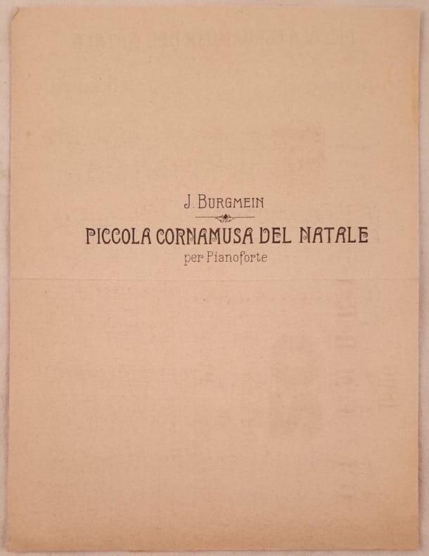 Edizione dei primi del novecento di questo spartito per pianoforte del pezzo "Piccola cornamusa del Natale" del compositore J. Burgmein pseudonimo utilizzato dall'editore Giulio Ricordi (1840-1912) Ottime condizioni, rare fioriture. Piegatura orizzontale. In 8. cm 25,5x19. pp. 3 Edition of early 20th century of this musical score for piano of the piece "Piccola cornamusa del Natale" by the composer J. Burgmein pseudonymous used by the editor Giulio Ricordi (1840-1912). Very good conditions. Horizontal folding In 8. cm 25,5x19. pp. 3.