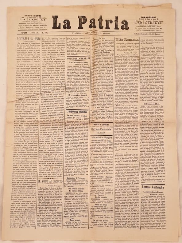 Numero del 12 13 maggio 1900 di questo raro quotidiano politico marchigiano. Tra gli articoli presenti: i cattolici e gli operai, La guerra nel TRansvaal, Il procuratore Cavalli, I disordini in Spagna, La succesione al trono d'Austria, Vita romana, Industria e commercio nel porto di Genova, Dalle Marche (Osimo, Recanati), Ancon Dorica, Rivista navale. In buone condizioni Raro. Brossura editoriale in buone condizioni generali con lievi usure e strappi ai margini e dorso. Piegature. Pagine si presentano in buone condizioni con rare fioriture. Piegature. In folio. Dim. 58x43 cm. Pp. (4)Number of the 12th 13rd of may 1900 of this scarce daily political magazine from Marche region. Between the articles inside: catholics and workers, War in TRansvaal, Cavalli, Desorders in Spain, Succession tot he throne of Austria, Roman life, Industry and trade in the harbour of Genoa, From Marche (Osimo, Recanati), Ancon Dorica, Naval magazine In good conditions Scarce copy. Editorial cover in good general conditions slightly worn in the edges and spine. Foldings. Inside pages are in good conditions with occasional foxings. Foldings.In folio. Dim. 58x43 cm. Pp. (4).