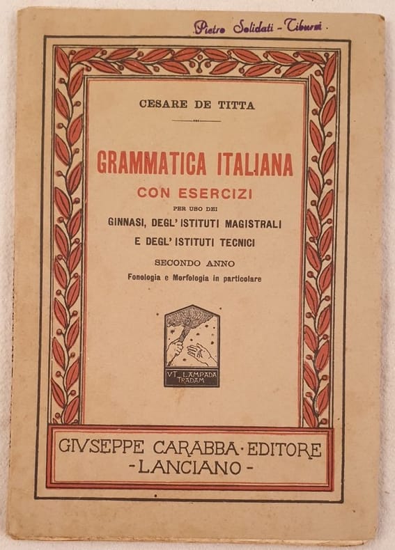 Edizione del 1930 di questa grammatica italiana per il secondo anno del ginnasio scritta da Cesare de Titta (1862-1933) poeta italiano, autore di componimenti in italiano, latino e vernacolo abruzzese.<BR><BR>Il volume riguarda in particolare la fonologia e morfologia con esercizi.<BR><BR>Bella copertina editoriale illustrata.<BR><BR>In ottime condizioni.<BR><BR>Copertina edigtoriale in buone condizioni generali con lievi usure ai margini e dorso. Legatura in buone condizioni. All'interno le pagine si presentano in ottime condizioni con rare fioriture. In 8. Dim. 19,5x13,5 cm. Pp. VIII+120.Edition of 1930 of this italian grammar for the second year of classical high school written by Cesare de Titta (1862-1933) italian poet, auhtor of components into italian, latin language and abruzzese dialect.<BR><BR>The volume particularly describes phonology and morphology with exercises.<BR><BR>Beautiful editorial illustrated cover.<BR><BR>In very good conditions.<BR><BR>Editorial cover in good general conditions slightly worn in the edges and spine. Binding in good conditions. Inside pages are in very good conditions with occasional foxings. In 8. Dim. 19,5x13,5 cm. Pp. VIII+120.