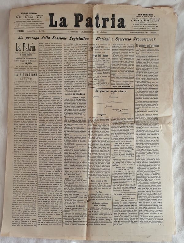 Numero del 16 17 maggio 1900 di questo raro quotidiano politico marchigiano. Tra gli articoli presenti: La proroga della sessione legislativa, La guerra anglo boera, Le feste di Napoli, Dalle Marche (Osimo, Porto San Giorgio) Dalle cento città (Milano, Ronciglione, Palermo, Lucca, Vicenza, Torino, Chieti, Cuneo), Ancon Dorica (Il giubileo sacerdotale del Cardinal Manara) ecc.. In buone condizioni. Raro. Brossura editoriale in buone condizioni generali con lievi usure e strappi ai margini e dorso. Piegature. Pagine si presentano in buone condizioni con rare fioriture. Piegature. In folio. Dim. 58x43 cm. Pp. (4)Number of the 16th 17th of may 1900 of this scarce daily political magazine from Marche region. Between the articles inside: Law session, Feast of Naples, From Marche (Osimo, Porto San Giorgio) <BR>From cento città (Milano, Ronciglione, Palermo, Lucca, Vicenza, Torino, Chieti, Cuneo), Ancon Dorica (priest jubilee of Cardinal Manara) etc.. In good conditions Scarce copy. Editorial cover in good general conditions slightly worn in the edges and spine. Foldings. Inside pages are in good conditions with occasional foxings. Foldings.In folio. Dim. 58x43 cm. Pp. (4).