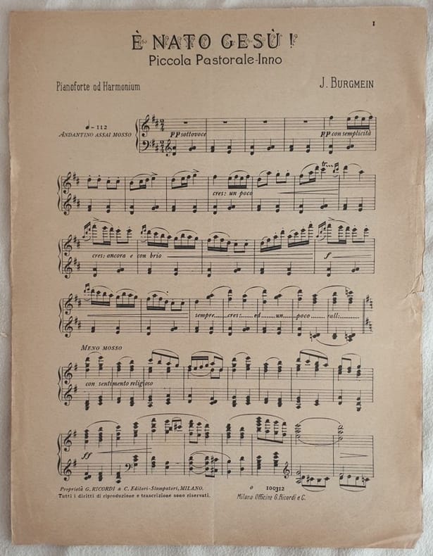 Edizione dei primi del novecento di questo spartito per pianoforte del pezzo "E' nato Gesù" del compositore J. Burgmein pseudonimo utilizzato dall'editore Giulio Ricordi (1840-1912). Ottime condizioni, rare fioriture. Piegatura orizzontale. In folio. cm 31,5x24,5. pp. 2.Ricordi edition of early 20th century of this musical score for piano "E' nato Gesù" by the composer J. Burgmein pseudonymous used by the editor Giulio Ricordi (1840-1912). Very good conditions, some foxings. In folio. cm 31,5x24,5. pp. 2.