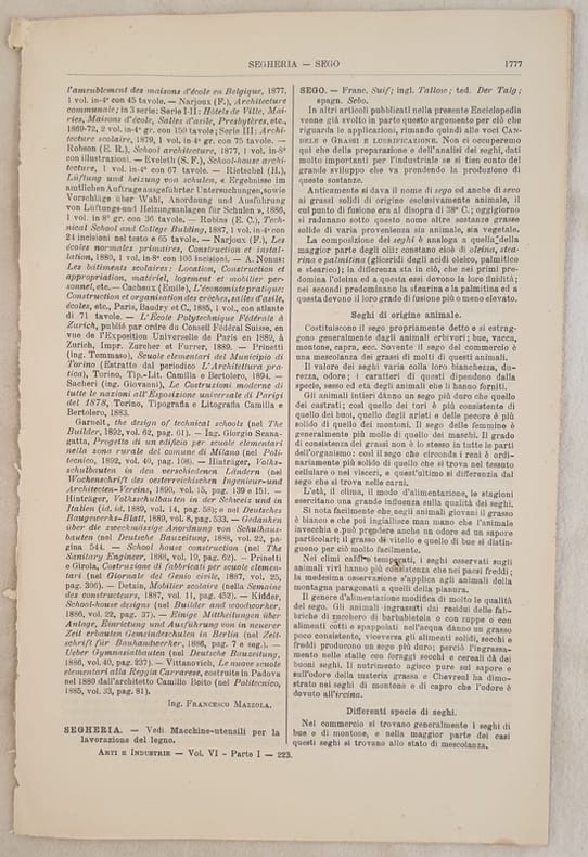Interessante estratto del 1889 circa tratto dall'Enciclopedia delle arti e industrie edita da Utet sel sego scritto da Cesare Serono. La parte relativa al sego consta di 13 pagine. L'autore descrive numerosi tipi di sego con le ricette. All'interno qualche illustrazione. In buone condizion Copertina assente. Legatura quasi assente. All'interno le pagine si presentano in ottime condizioni con rare fioriture. In 4. Dim. 29x19 cm. Pp. da 1777 a 1789. Interesting extract of 1889 circa from Enciclopedia delle arti e industrie edited by Utet about tallow written by Cesare Serono <BR>The part relating tallow is made up of 13 pages. The author describes different examples of tallow and its recipes Different illustrations inside. In good conditions. Cover is missing. Binding in good conditions. Inside pages are in very good conditions with occasional foxings. In 4. Dim. 29x19 cm. Pp. from 1777 to 1789.