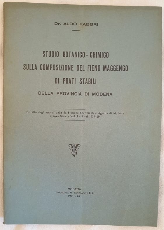 Interessante fascicolo del 1931, uno studio botanico chimico sulla composizione del fieno maggengo di prati stabili della provincia di Modena di Aldo Fabbri. Estratto dagli Annali della R. Stazione sperimentale Agraria di Modena Nuova serie vol. 1 anni 1927-29. Alcune pagine finali sono state tagliate poichè non relative all'estratto che risulta completo. In buone condizioni. Copertina editoriale in buone condizioni con lievi usure ai margini e dorso. Legatura in buone condizioni. All'interno le pagine si presentano in ottime condizioni con rare fioriture. Piegatura verticale. In 8. Dim. 24,5x17 cm. Pp. da 221 a 232. Interesting pamphlet of 1931, a chemical botanical study about composition of hay in grasses of province of Modena written by Aldo Fabbri. Extract from Annali della R. Stazione sperimentale Agraria di Modena Nuova serie vol. 1 anni 1927-29. Some final pages not belonging to the extract have been cut, the extract is complete. In good conditions. Editorial cover in good conditions slightly worn in the edges and spine. Binding in good conditions. Inside pages are in very good conditions with occasional foxings. Vertical folding. In 8. Dim. 24,5x17 cm. Pp. from 221 to 232.