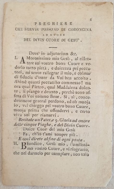 Interessante opuscolo del 1832, preghiere che possono servire da coroncina per il Divino Cuore di Gesù. In buone condizioni. Copertina assente. Legatura quasi assente. All'interno le pagine si presentano in buone condizioni con rare fioriture. Piegatura orizzontale. In 16. cm. 16x9,5. Pp. 4IInteresting pamhplet of 1832, prayers to be used as a crown for the Holy Heart of Jesus . In good conditions. Cover is missing. Binding is almost missing. Pages in good conditions with occasional foxings. Horizontal folding. In 16. cm. 16x9,5. Pp. 4