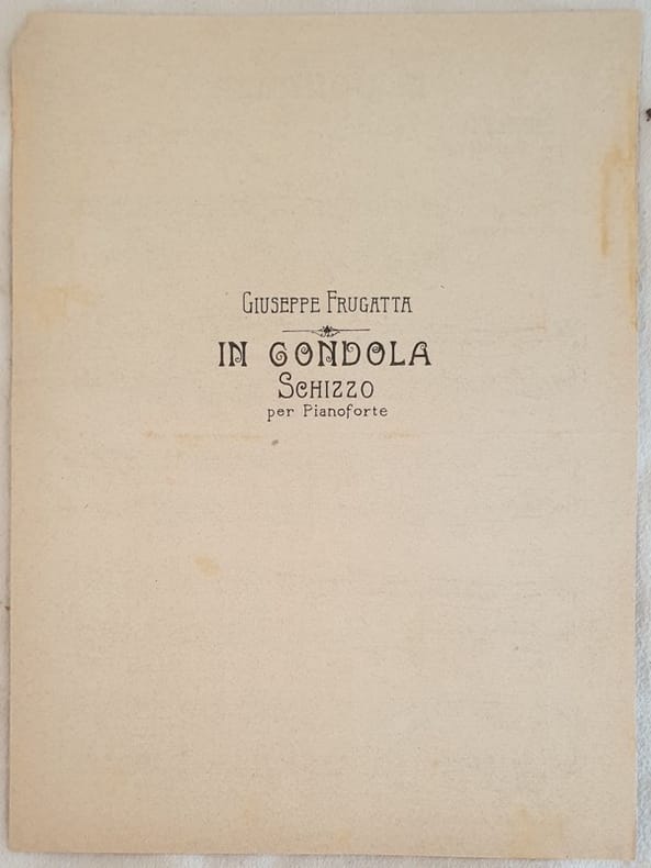 Edizione Ricordi di questo spartito per pianoforte del pezzo "In gondola" per pianoforte del compositore originario di Bergamo Giuseppe Frugatta (1860-1933). Senza data ma di inizio novecento. Ottime condizioni. Piegatura orizzontale. In 8. cm 25,5x19. pp. (3). Ricordi edition of this musical score for piano "In gondola" by the composer from Bergamo Giuseppe Frugatta (1860-1933).. Not dated but of early 20th. Very good conditions. Horizontal folding In 8. cm 25,5x19. pp. (3).