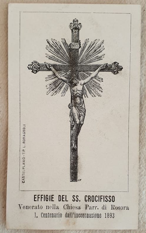 Immaginetta sacra del 1893 della effigie del SS. crocifisso venerata nella Chiesa di Rosora (Ancona) nel primo centenario dell'Incoronazione.<BR>In ottime condizioni. In 24. Dim. cm 11x6,5. Holy image of 1893 of the image of SS. crossfix venerated in the Chruch of Rosora (Ancona) in the first hundred years of crowning. In very good conditions.<BR>In 24. Dim. cm 11x6,5.