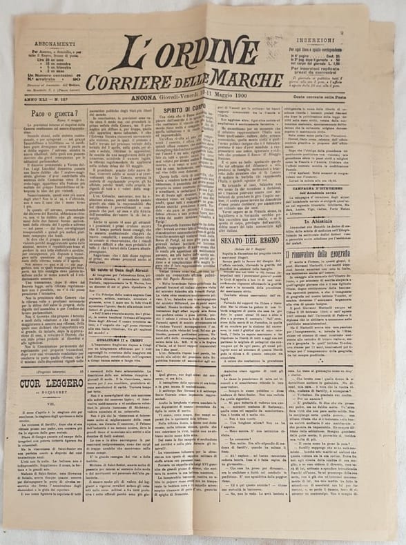 Numero del 10 11 maggio 1900 di questo raro quotidiano politico marchigiano. Il quotidiano venne fondato il 5 ottobre 1866 dal patriota risorgimentale e poeta ripano Luigi Mercantini. A partire dal 1926 assunse il nome di "Corriere Adriatico" tuttora esistente. Tra gli articoli presenti: Pace o guerra?, un saluto al Duca degli Abruzzi, Spirito di corpo, Abissinia, Rinnovatore della geografia (mrte di Giovanni Marinelli), I disordini di Jativa, Il re di Baviera in fin di vita, L'eruzione del Vesuvio, I sovrani a Napoli, Inaugurazione di musei a Milano ecc... In buone condizioni Raro. Brossura editoriale in buone condizioni generali con lievi usure e strappi ai margini e dorso. Piegature. Pagine si presentano in buone condizioni con rare fioriture. Piegature. In folio. Dim. 58x43 cm. Pp. (4) Number of the 10th 11th of may 1900 of this scarce daily newspaper form Marche. The newspaper was established the 5th of october 1866 byt he patriot and poet from Risorgimento period Luigi Mercantini. From 1926 it was renamed "Corriere Adriatico" and it is still existing. Between the articles inside: Peace or war?, a greeting to the Duke of Abruzzi, Body spirit, Abissinia, Death of Giovanni Marinelli), Desorders of Jativa, the King of Baviera is dying, Eruption of Vesuvio, Soverains in Naples, Inauguration of museums in Milan etc.. In good conditions Scarce copy. Editorial cover in good general conditions slightly worn in the edges and spine. Foldings. Inside pages are in good conditions with occasional foxings. Foldings.In folio. Dim. 58x43 cm. Pp. (4).
