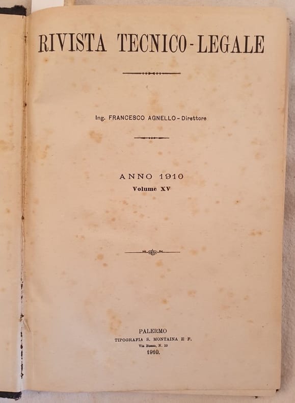 Annata del 1910 di questa rivista tecnico legale a cura dell'Ing. Francesco Agnello. All'interno quattro parti: Studi e monografie (L'azienda ferroviaria di stato, della presente legislazione italiana sulle case popolari, relazioni economiche fra cpaitale e lavoro in vari distretti minerari, le ferrovie ai ferroviari), Giurisprudenza, Leggi e decreti regolamenti e circolari minsteriali (esempi di calcolo di costruzioni resistenti alle scosse sismiche) Appunti e note quesiti e risposte bibliografia (L'esercizio ferroviario di Stato nell'anno finanziario 1908 1909, infortuni in agricoltura, per l'industria solfifera siciliana, il chinino di stato e la lotta contro la malaria, Riccardo Mazzanti ecc...<BR>In discrete condizioni. Copertina cartonato in mediocri condizioni generali con usure ai margini e dorso. Legatura in buone condizioni. All'interno le pagine si presentano in buone condizioni con rare fioriture. In 4. Dim. 25x18 cm. Pp. 72+184+68+48. Year collection of 1910 of this law technical magazine by Ing. Francesco Agnello. In fair conditions. Carton cover in poor general conditions with wearings in the edges and spine. Binding in good conditions. Inside pages are in good conditions with occasional foxings. In 4. Dim. 25x18 cm. Pp. 72+184+68+48.