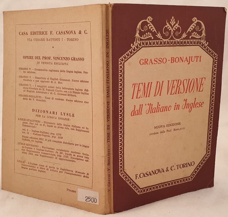 Edizione del 1953 di questo manuale sui temi di versione dal'italiano in inglese scritto da Bonajuti e Grasso. Nota manoscritta alla prima carta bianca. In ottime condizioni. Copertina editoriale in ottime condizioni generali con lievi usure ai margini e dorso. Legatura in buone condizioni. All'interno le pagine si presentano in ottime condizioni con rare fioriture. In 8. Dim. 19,5x13,5 cm. Pp. 159. Edition of 1953 of this manual about themes of version from italian into english bwritten by Bonajuti and Grasso. Handwritten note in the first blank page. In very good condiitons. Editorial cover in very good general conditions alightly worn in the edges and spine. Binding in good conditions. Inside pages are in very good conditions with occasional foxings. In 8. Dim. 19,5x13,5 cm. Pp. 159.