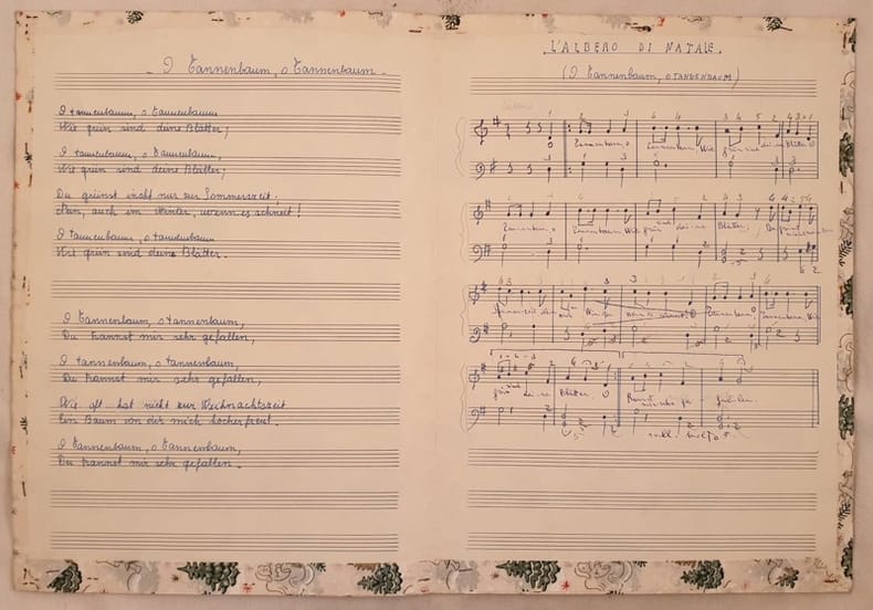 Spartito manoscritto del tardo novecento della melodia L'albero di Natale O Tannenbaum o tannenbaum. Spartito per pianoforte e testo. Spartito ricoperto da carta natalizia. In buone condizioni. Copertina natalizia in buone condizioni con lievi usure ai margini e dorso. Legatura assente. Pagine in buone condizioni con rare fioriture. In 4. cm. 33x24. Pp. 2.Handwritten musical score of late 20th century of the melody L'albero di Natale O Tannenbaum o tannenbaum. Musical score for piano and text. Musical score covered by Christmas decorated paper. In good conditions. Christmas cover in good general conditions slightly worn in the edges and spine. Binding is missing. Pages in good conditions with occasional foxings. In 4. cm. 33x24. Pp. 2.