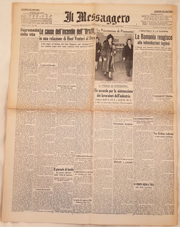 Numero del 26 gennaio 1940 dello storico quotidiano "Il Messaggero" fondato nel 1878 da Luigi Cesana con sede a Roma.<BR>All'interno: supremazia della vita, Le cause dell'incendio dell'"Orazio" in una relazione di Host Venturi al Duce, La principessa di Piemonte, La Romania reagisce alle intimidazioni inglesi, Un accordo per la sistemazione dei lavoratori dell'industria, Van Kleffens riafferma la rigida neutralità dell'Olanda, La risposta inglese a Tokio, Il giornale di bordo del primo ufficiale della Città di Ajaccio, L'equipaggio del Columbus, , La principessa di Piemonte al discorso di Tucci sul Tibet, Il pianista Ceccarelli al Liceo Tasso, Babini di Ferrara vince la gara di discesa, La miracolosa immagine della Madonna di Pompei trasportata a San Pantaleo, Il Pr. Carso a Villa Glori vinto da Crispi, Luciano Manara nelle lettere alla contessa Spini, S'inizia il lancio dei cappelli nell'arena negli Stati Uniti, La bonifica del latifondo decisa del governo di Franco sull'esempio dell'Italia, La nomina di Mario Urbinati ecc...<BR>Pubblicità d'epoca.<BR>Brossura editoriale in buone condizioni generali con lievi usure ai margini e dorso. Piegature. Legatura in buone condizioni. All'interno le pagine si presentano in buone condizioni con rare fioriture. In folio. Dim. 59x45,5 cm. Pp. 4. Number of the 26th of January 1940 of this daily newspaper "Il Messaggero" established in 1878 by Luigi Cesana in Rome.<BR>Inside: supremacy of life, Causes of fire of '"Orazio" in a report of Host Venturi to Mussolini, princess of Piedmont, Romania reacts to english betrays, Van Kleffens,english answer to Tokio, Ajaccio, Columbus, , Princess of Piedmont to the speech of Tucci on Tibet, Ceccarelli to Liceo Tasso, Babini of Ferrara, Miracolous image of Madonna di Pompei transported to San Pantaleo, Il Pr. Carso in Villa Glori won by Crispi, Luciano Manara in the letter to Spini, S'inizia il lancio dei cappelli nell'arena negli Stati Uniti, Drainage of lands of the government of Franco on the examples of Italy, Nomination of Mario Urbinati etc..<BR>Advertisings of that time.<BR>In good conditions. <BR>Editorial cover in good general conditions slightly worn in the edges and spine. Foldings. Binding in good conditions. Inside pages are in good conditions with occasional foxings. In folio. Dim. 59x45,5 cm. Pp. 4.