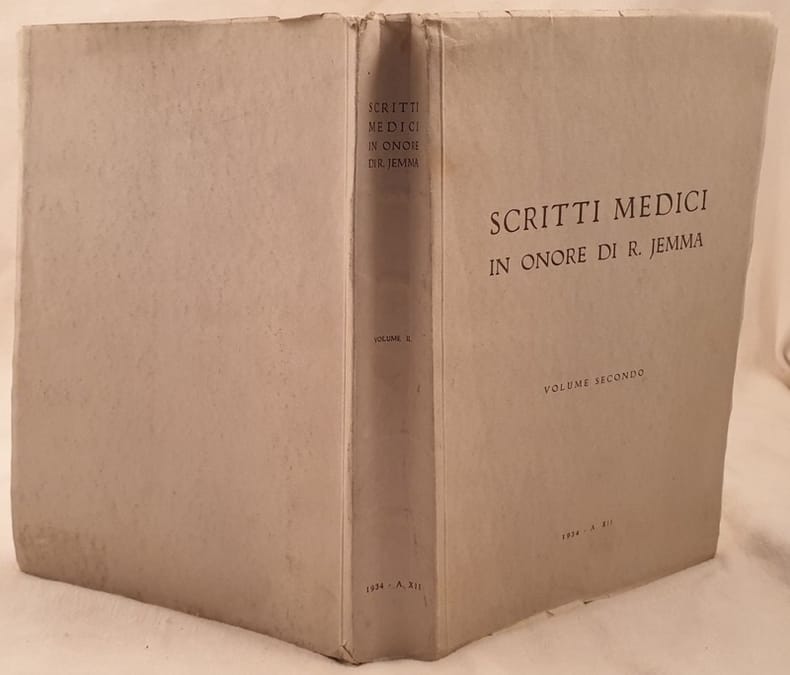 Edizione del 1934 di questa raccolta di scritti medici in onore del Prof. R. Jemma nel 30° anno d'insegnamento a cura dei Prof. Nasso e Schwarz. siamo in possesso del volume secondo solamente. All'interno tutta una serie di pubblicazioni di pediatria (es. considerazioni critiche sopra un caso di avvelenamento mortale da Mistol, influenza dela pertosse nella tubercolosi dell'infanzia, saprofiti del latte e loro importanza, ascesso cerebrale nel lattante, sifilide congenita e cardiopatie, tossicosi dissenteriche nei lattanti, chirurgia del labbro leporino, odontoiatria in pediatria, studio della terapia della pleurite purulenta pneumococcica, terapia delle peicarditi purulente nell'infanzia, urticaria nella malaria dei bambini, ormonosensibilità, leucolisi, kala azar infantile nel Portogallo ecc... Alcuni autori: Aiello, Alessandri, Barberi, Belfanti, Ottonello, Bessau, Chiarolanza, Cannata, Cozzolino, Czerny, Elizalde, Devoto, Fischi, Gargano, Gatto, Gerbasi, Morganti ecc... Qualche foto in bianco e nero. In ottime condizioni. Copertina editoriale in buone condizioni generali con usure e piccoli strappi ai margini e dorso. Legatura in buone condizioni. Pagine in ottime condizioni con rare fioriture. In 4. cm 28,5x20. Pp. da 689 a 1438. Edition of 1934 of this collection of medical writings in honour of Prof. R. Jemma in 30° year of teaching written by Prof. Nasso e Schwarz. We only have the second volume. Between the authors inside: Aiello, Alessandri, Barberi, Belfanti, Ottonello, Bessau, Chiarolanza, Cannata, Cozzolino, Czerny, Elizalde, Devoto, Fischi, Gargano, Gatto, Gerbasi, Morganti ecc... Some black and white photoes. In very good conditions. Editorial cover in good general conditions with wearings and little tears in the edges and spine. Binding in good conditions. Pages are in very good conditions with occasional foxings. In 4. cm 28,5x20. Pp. da 689 a 1438.