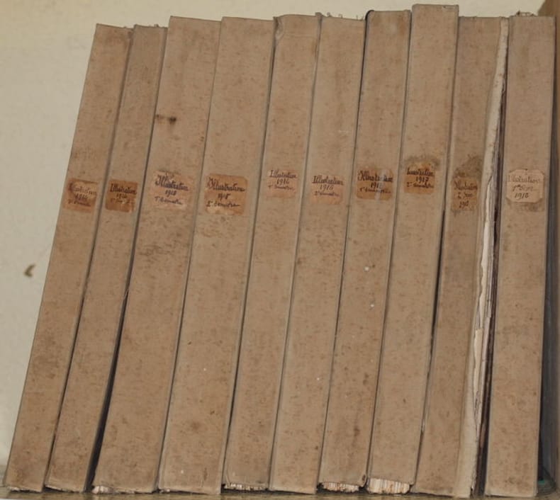 16 vol. in-folio reliure postérieure demi-toile grège, L'Illustration 1914-1918 (15 Volumes : Complet) Tome 1 : Août - Décembre 1914 (n° 3727 au 3747) ; Tome 2 : Janvier - Avril 1915 (n° 3748 au 3764) ; Tome 3 : Mai - Août 1915 (n° 3765 au 3780) ; Tome 4 : Août - Octobre 1915 (n° 3781 au 3791) ; Tome 5 : Novembre - Décembre 1915 (n° 3792 au 3799) ; Tome 6 : Janvier - Mars 1916 (n° 3800 au 3812) ; Tome 7 : Avril - Juin 1916 (n° 3813 au 3825) ; Tome 8 : Juillet - Septembre 1916 (n° 3826 au 3838) ; Tome 9 : Septembre - Décembre 1916 (n° 3839 au 3851-3852) ; Tome 10 : Janvier - Mars 1917 (n° 3853 au 3865) ; Tome 11 : Avril - Juin 1917 (n° 3866 au 3878) ; Tome 12 : Juillet - Septembre 1917 (n° 3879 au 3892) ; Tome 13 : Octobre - Décembre 1917 (n° 3893 au 3904) ; Tome 14 : Janvier - Avril 1918 (n° 3905 au 3920) ; Tome 15 : Avril - Août 1918 (n° 3921 au 3938 ) ; Tome 16 : Août - Décembre 1918 (n° 3939 au 3956) [ Première Guerre Mondiale ]