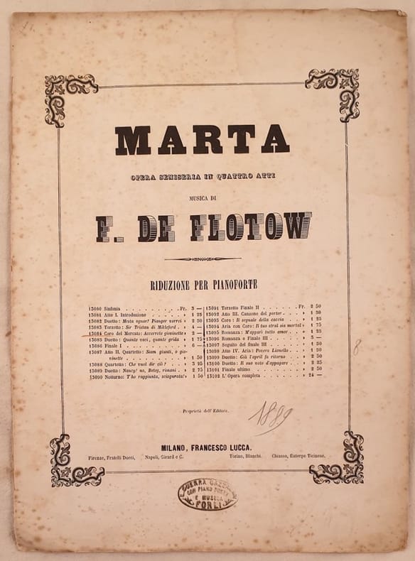 Bello spartito per pianoforte del 1880 circa della melodia "Coro del Mercato Accorrete giovinette" tratta dall'opera Marta del compositore tedesco Friedrich Von Flotow (1812-1883). In ottime condizioni con fioriture. Copertina in buone condizioni generali con lievi usure au margini e dorso. Legatura in buone condizioni. Pagine in ottime condizioni con rare fioriture. Formato cm. 36x26. Pp. 6. Beautiful musical score of 1880 circa of the melody "Coro del Mercato Accorrete giovinette" for piano formt he work Marta byt hegerman composer Friedrich Von Flotow (1812-1883). In good conditions with foxings. Cover in good conditions slightly worn in the edges and spine. Binding in good conditions. Pages in very good conditions with occasional foxings. Formato cm. 36x26. Pp. 6.