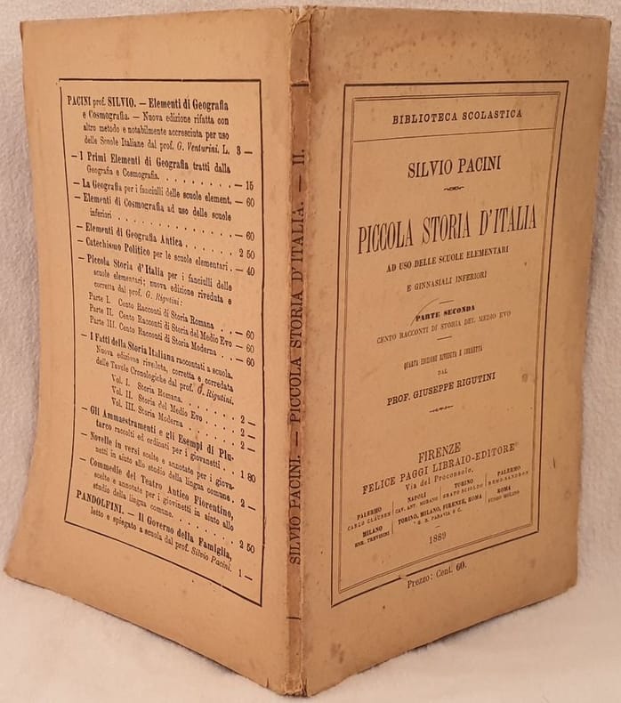 Edizione del 1889 di questa raccolta di racconti della storia d'Italia di Silvio Pacini ad uso delle scuole elementari. Edizione riveduta e corretta dal Prof. Giuseppe Rigutini. Siamo putrtroppo in possesso della seconda parte contenente cento racconti di storia del medioevo. All'interno: Venuta di Carlo Magno, Belisario, Origine di Venezia, Il trattato di Verdun, Maometto, Berengario II, Labattaglia di Civitella, Arrigo IV a Canossa, Distruzione di Milano, La Lega Lombarda, La battaglia di Tagliacozzo, Francesco Foscari, La Congiura de Pazzi ecc... In ottime condizioni. Copertina editoriale in ottime condizioni generali con lievi usure ai margini e dorso. Legatura in buone condizioni. Pagine in ottime condizioni con rare fioriture, ancora da tagliare. In 8. Dim. 19,5x13,5 cm. Pp. 96. Edition of 1889 of this collection of tales of italian history written by Silvio Pacini for the usage of rpimary schools Edition reviewed by Prof. Giuseppe Rigutini. Unfortunately we onyl have the second part containing one hundred ctales oh history of Middle age. Inside: Carlo Magno, Belisario, Origin of Venice, Treaty of Verdun, Maometto, Berengario II, Labattaglia di Civitella, Arrigo IV a Canossa, Distruzione di Milano, La Lega Lombarda, Battle of Tagliacozzo, Francesco Foscari, La Congiura de Pazzi ecc... In very good conditions. Editorial cover in very good general conditions slightly worn in the edges and spine. Binding in good conditions. Inside pages are in very good conditions with occasional foxings, still uncut. In 8. Dim. 19,5x13,5 cm. Pp. 96