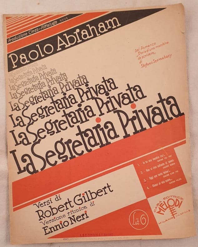 Spartito musicale del 1931 della melodia "Oggi son tanto felice!..." di Paolo Abraham. Versi di Robert Gilbert. In buone condizioni. Brossura editoriale in ottime condizioni generali con lievi usure e strappi ai margini e dorso. Legatura editorialmente assente. All'interno le pagine si presentano in buone condizioni con rare fioriture. In 4. Dim. 34x27 cm. Pp. 2musical score of 1931 of the melody"Oggi son tanto felice!..." by Paolo Abraham. Verses by Robert Gilbert. In good conditions. Editorial cover in very good general conditions slightly worn in the edges and spine. Binding editoriarly missing. Inside pages are in good conditions with occasional foxings. In 4. Dim. 34x27 cm. Pp. 2.