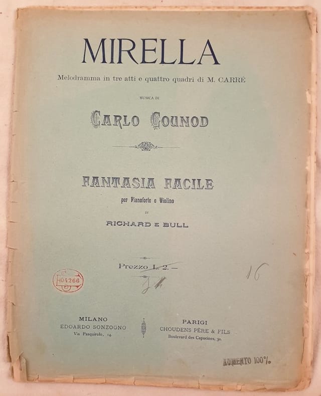 Spartito musicale di fine ottocento della melodia "Fantasia facile" tratta dallìopera "Mirella"del compositore francese Charles Francois Gounod (1818-1893). Partitura per pianoforte e vilino di Richard e Bull. In buone condizioni. Brossura editoriale in discrete condizioni generali con usure e strappi ai margini e dorso. Legatura editorialmente assente. All'interno le pagine si presentano in buone condizioni con rare fioriture. In 4. Dim. 35,5x27 cm. Pp. 5+3.musical score of late 19th century of the melody "Fantasia facile" from the work "Mirella"by the french composer Charles Francois Gounod (1818-1893). musical score for piano and violin byRichard and Bull. In good conditions. Editorial cover in fair general conditions with wearings and tears in the edges and spine. Binding editoriarly missing. Inside pages are in good conditions with occasional foxings. In 4. Dim. 35,5x27 cm. Pp. 5+3.