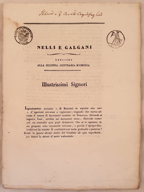 Interessante pubblicazione del 1832, una sentenza della città di Firenze sulla memoria tra Nelli e Galgani per una cessione di beni. Timbro della città di Firenze alla prima pagina. In ottime condizioni. Copertina assente. Legatura quasi assente. All'interno le pagine si presentano in ottime condizioni con fioriture. In 4. Dim. 28x21 cm. Pp. 19.Interesting pamphlet of 1832, a sentence of the city of Florence about the memory between Nelli and Galgani for acession of goods. Stamp of the city of Florence in the first page. In very good conditions. Cover is missing. Binding is almost missing. Inside pages are in very good conditions with foxings. In 4. Dim. 28x21 cm. Pp. 19.