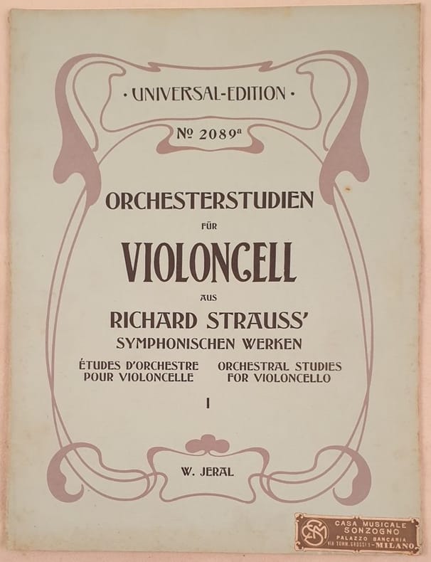 Bello spartito del 1910 di alcuni studi per violoncello tratti da alcune opere di Richard Strauss. Bella illustrazione al frontespizio. In buone condizioni. Copertina editoriale in buone condizioni generali con lievi usure ai margini e dorso. Legatura quasi assente. Pagine in ottime condizioni con rare fioriture. In folio. Formato cm. 31,5x24. Pp. 34.Beautiful musical score of 1910 of some studies for violoncello from some works by Rtichard Strauss. Beautiful illustration in the title page. In good conditions. Editorial cover in good conditions slightly worn in the edges and spine. Binding is almost missing. Pages in very good conditions with occasional foxings. In folio. Formato cm. 31,5x24. Pp. 34.