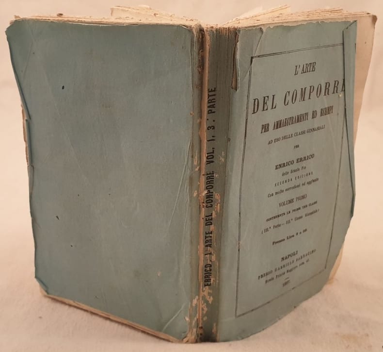 Interessante opera del 1867 sull'arte della composizione scritto da Enrico Errico. Siamo purtroppo in possesso solo del volume primo contenenete la terza parte per la terza classe ginnasiale. All'interno: sintassi, lingua, metafora, sinnedoche, metonimia, dialogo, lettere ecc... In buone condizioni. Copertina editoriale in buone condizioni con lievi usure ai margini e dorso. Legatura in discrete condizioni con qualche lieve rottura. All'interno le pagine si presentano in ottime condizioni con rare fioriture, ancora da tagliare. In 8. Dim. 19x12,5 cm. Pp. XXII+325. Interessting work of 1867 about the art of composition written by Enrico Errico. Unfortunately we only have the first volume containing the third part for third class. Inside: syntaxis, language, metafora, sinnedoche, metonimia, dialogue, letters ecc... In good conditions. Editorial cover in good conditions slightly worn in the edges and spine. Binding in fair conditions with some slight crack. Inside pages are in very good conditions with occasional foxings, still uncut. In 8. Dim. 19x12,5 cm. Pp. XXII+325.
