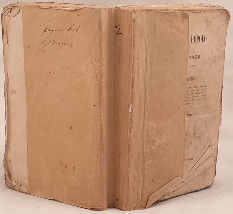 Edizione del 1850 dell'opera "I misteri del popolo" dello scrittore francese Eugene Sue (1804-1857) noto per i suoi romanzi d'appendice a carattere sociale I misteri di Parigi, considerato il primo romanzo thriller, e L'ebreo errante. L'opera era composta da tre tomi siamo purtroppo in possesso solo del secondo tomo. Antiche note manoscritte. In mediocri condizioni. Copertina morbida coeva in mediocri condizioni generali con usure ai margini e dorso. Parte mancante al piatto anteriore. Legatura in mediocri condizioni con qualche pagina staccata. Pagine si presentano in buone condizioni con fioriture. Piegature alle prime 4 pagine. In 16. Dim. 18,5x12,5 cm. Pp. 627. Edition of 1850 of the work "I misteri del popolo" by the french writer Eugene Sue (1804-1857) famous for his social novels in instalments as I misteri di Parigi, considered the first thriller novel, and L'ebreo errante.<BR>The work was made up of three tomes unfortunately we only have the second tome.<BR>Handwritten notes. Soft coeval cover in poor conditions with wearings in the spine. Missing part in the front plate. Binding in poor conditions with some page detached. Inside pages are in good conditions with foxings. Foldings in the first 4 pages. In 16. Dim. 18,5x12,5 cm. Pp. 627.