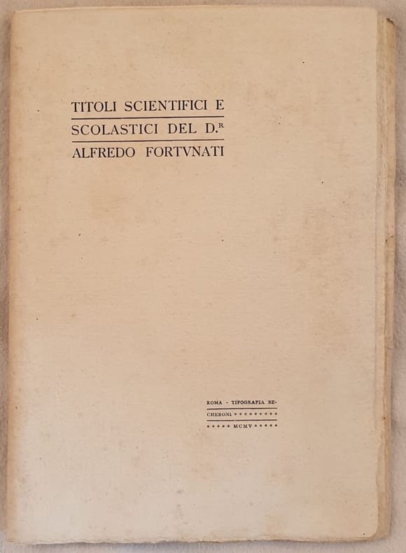 Pubblicazione del 1905 sulle opere del Dott. Alfredo Fortunati. All'interno la lista delle opere da lui pubblicate con relativa recensione. Alla fine i titoli accademici dello stesso Fortunati. Elegante pubblicazione in carta pregiata. In buone condizioni Brossura editoriale in ottime condizioni generali con lievi usure ai margini e dorso. Legatura editorialmente mancante. Pagine in ottime condizioni con rare fioriture. In 8. cm 24x17. Pp. 30.Nice writing of 1905 about the works of the Doct. Alfredo Fortunati Inside the list of the works he published with relative commentation. At the end the titles of the same Fortunati. Elegant pamphlet with precious paper. In good conditions. Editorial cover in very good general conditions slightly worn in the edges and spine. Binding editoriarly missing. Pages in very good conditions with occasional foxings.. In 8. Dim. 24x17 cm. Pp. 30.