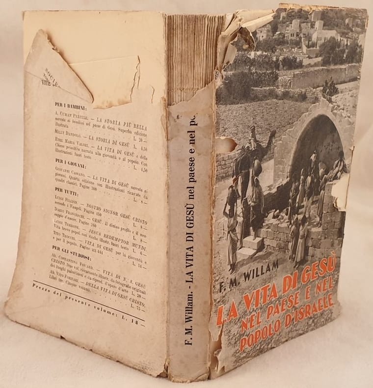 Edizione del 1933 di questa opera sulla vita di Gesu nel paese di israele scritto da Francesco Michele William. All'interno: Liete novelle in tempi difficili, La nativita e infanzia di Gesu, Attivita pubblica del Battista, L'opera di Gesu in Galilea, Alla festa in Gerusalemme, Parabole del regno dei cieli, L'apogeo dell'attivita messianica in Galilea, Passione e morte di Gesu, Interrogatori dinanzi alla corte di giustizia romana ecc... All'interno sono presenti alcune planches fotografiche che mostrano paesaggi: campagna di Betlemme, vecchia Nazareth, Valle del Cedron, pianura di Jezreel, Monte degli ulivi, Betfage, Moschea di Omar, via del cedron ecc... In mediocri condizioni Copertina editoriale in mediocri condizioni con usure ai margini e dorso. Piatto anteriore della sovracoperta staccata. Legatura in discrete condizioni con qualche rottura. Pagine in buone condizioni con rare fioriture. In 8. cm 22,5x15,5. Pp. IV+518+(2).Edition of 1933 of this work about life of Jesus in Israel written by Francesco Michele William. Inside: Liete novelle in tempi difficili, La nativita e infanzia di Gesu, Attivita pubblica del Battista, L'opera di Gesu in Galilea, Alla festa in Gerusalemme, Parabole del regno dei cieli, L'apogeo dell'attivita messianica in Galilea, Passione e morte di Gesu, Interrogatori dinanzi alla corte di giustizia romana ecc... Insdie there are different photographic planches showing views: campagna di Betlemme, vecchia Nazareth, Valle del Cedron, pianura di Jezreel, Monte degli ulivi, Betfage, Moschea di Omar, via del cedron ecc... In poor conditions Editorial cover in poor conditions with wearings in the edges and spine. Front plate of front dustjacket is detached. Binding in fair conditions with some cracks. Pages in good conditions with occasional foxings. In 8. cm 22,5x15,5. Pp. IV+518+(2).